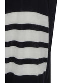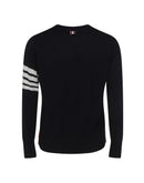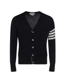 Fleece wool Cardigan by Thom Browne, striped cuffs with button, ribbed hem with adjustable side slits with buttons, V-neck, front button closure, two patch pockets on front, iconic brand logo bands on left arm, internal profiles with iconic brand colors.