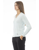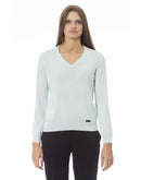 Elevate your wardrobe with the Baldinini Trend V-neck Sweater, a perfect blend of comfort and luxury. Crafted with a finesse only Baldinini can deliver, this light blue sweater features long sleeves and sophisticated ribbed trim at the neck, cuffs, and bottom. The regular fit ensures a flattering silhouette while the signature monogram in metal adds a touch of exclusivity. Ideal for fashion-forward individuals who refuse to compromise on style or quality.