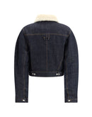 The De-Nîmes Ovalo Denim Bomber by Jacquemus reimagines the classic aviator silhouette with a contemporary and artisanal touch. Crafted from rinsed raw indigo denim, it features contrasting stitching and a pointed faux-shearling collar for added texture and warmth. Rounded sleeves and a concealed button closure lend a relaxed sophistication, while welt pockets embroidered with the signature “J” and a matching back loop highlight the brand’s refined detailing. Fully lined in faux shearling with engraved metal buttons and adjustable tabs at the hem, the jacket offers a straight fit that perfectly balances comfort and modern style.