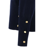 Thom Browne’s virgin wool Sweater is an iconic piece with a clean yet richly tailored design. A classic crew neck combines with a ribbed high hem, featuring practical side buttons that allow you to adjust the slits with discretion and functionality. The cuffs, also ribbed and button-fastened, add a touch of structured elegance. Distinguishing the sweater are the brand’s iconic horizontal bands, positioned on the left arm, which lend instant recognition and a graphic accent typical of the Thom Browne style.
