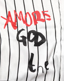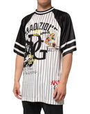 Gorgeous brand new, 100% Authentic Dolce & Gabbana T-shirt “Tradizione” oversized T-shirt from the men’s collection. Designed in a baseball jersey-inspired silhouette, this shirt features a striking pinstripe pattern contrasted by black raglan sleeves with sporty stripes. The front is decorated with vibrant, artistic graffiti-style graphics including the signature DG logo, religious and romantic imagery, and expressive text such as “Tradizione”, “Mon Amour”, “Amore”, and “God the”.