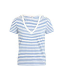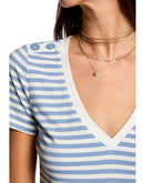 The Morgan De Toi 241-DINA women’s short-sleeve t-shirt features a timeless horizontal stripe pattern and a contrasting V-neckline for a touch of casual elegance. Crafted from a premium blend of 60% viscose, 32% polyester, 6% elastane/lycra, 1% metallic fiber, and 1% polyamide, this top ensures comfort, stretch, and a subtle sheen. The short sleeves and relaxed fit make it an ideal choice for spring and summer, perfect for everyday wear, leisure activities, or informal outings. Distinctive shoulder details add a unique and stylish finish, making this t-shirt a must-have for women seeking both practicality and refined style.