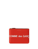 Calfskin Coin Purse by Comme des Garçons, contrasting printed logo on front and back, top zipper closure, single internal compartment, brand signature printed press-stamped on front.