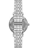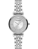 Women’s watch by Emporio Armani. With round case of 32 mm made of stainless steel of silver colour, with glossy finish. The thickness is 8 mm. The glass is transparent. The dial is silver. The distance of the anse is 14 mm. There are crystals on the dial. The bracelet is made of silver-colored stainless steel with a glossy finish. The closure is: deployant closure. The resistance to water is 3 atm. The movement is quartz / 2 spheres. This 32mm Emporio Armani watch features a silver-colored sunburst dial, two-ball movement and steel bracelet. The reference is: AR11445