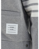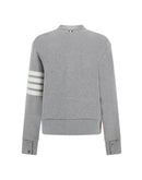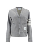 Cotton Cardigan by Thom Browne, v neck line, button closure, two welt pockets on front, ribbed cuffs and bottom hem, stripe details on left sleeve, lateral slits with button closure and stripes.