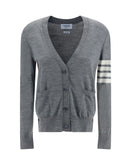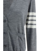 Thom Browne Cardigan made of soft merino wool, featuring a monochrome design and slim fit. Featuring a V-neck with ribbed trim, it has a front button closure and two patch pockets on the front. The brand’s iconic horizontal bands decorate the left arm, adding a distinctive touch. Slight adjustable side slits with buttons complete the garment, for greater freedom of movement. A refined and versatile garment, perfect for smart or casual looks.